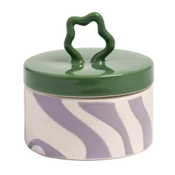 De Liquid voorraadpot small van &Klevering heeft een diameter van 10,5 centimeter en een hoogte van 10,5 centimeter. De pot is gemaakt van keramiek en is vaatwasser bestendig. De Liquid voorraadpot heeft een witte ondergrond met een lila motief en een groene deksel.