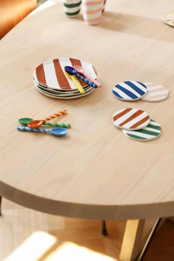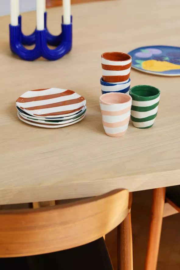 De Oblique mok 0,25L set van 4 van &Klevering bestaat uit gestreepte mokken met elk een andere kleur. Elke mok heeft een diameter van 8 centimeter en een hoogte van 10 centimeter. De bekers zijn gemaakt van dolomiet en zijn vaatwasser bestendig.