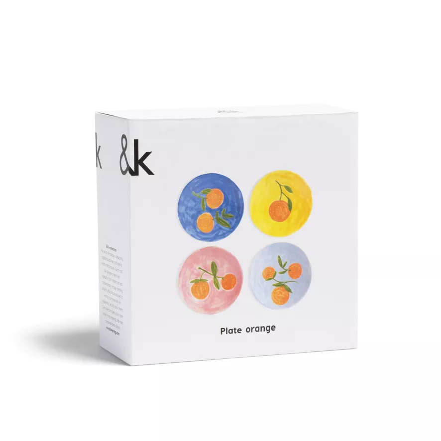 De Orange gebaksbordje Ø16 set van 4 van &Klevering bestaat uit verschillende bordjes met sinaasappels en een kleurrijk motief. Elk bord heeft een diameter van 16 centimeter en een hoogte van 2,5 centimeter. De gebaksbordjes zijn gemaakt van keramiek en zijn vaatwasser bestendig.