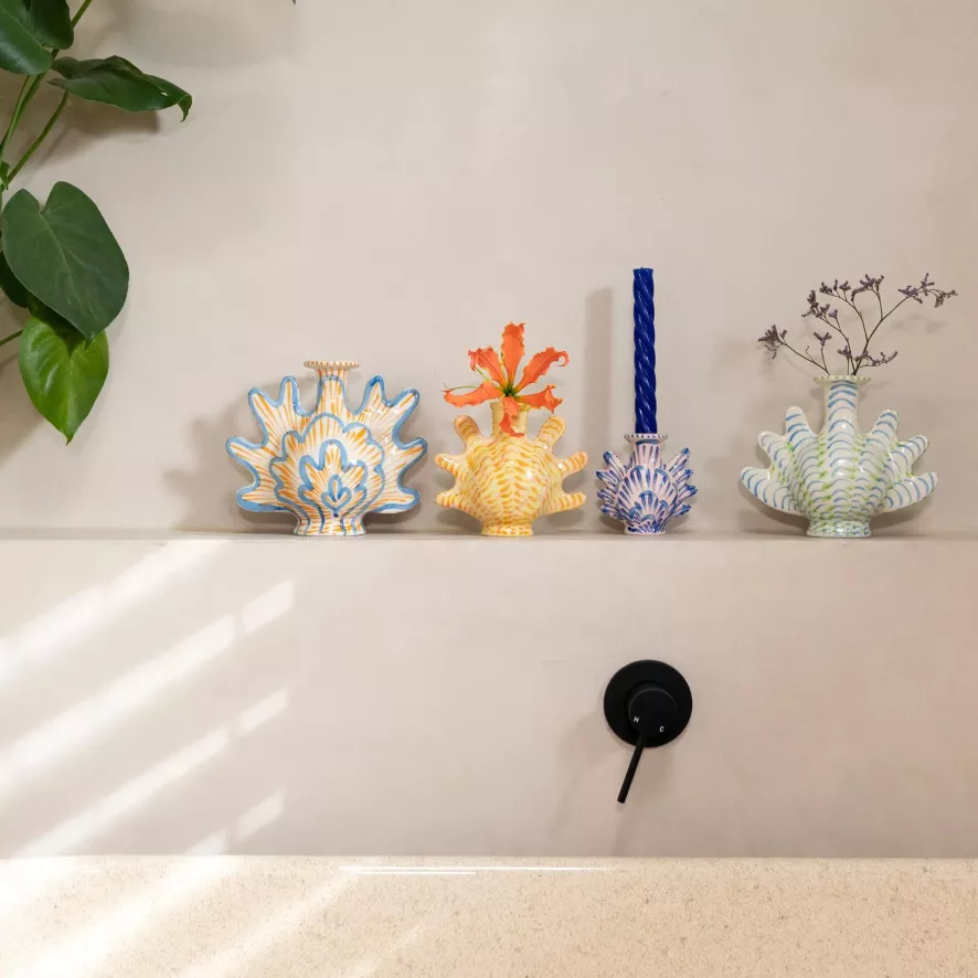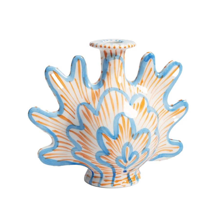 De Shellegance kandelaar large van &klevering is ontworpen door Lucie de Moyencourt. De kaarsenhouder heeft een lengte van 21 centimeter, een breedte van 11 centimeter en een hoogte van 17 centimeter. De kandelaar is gemaakt van keramiek en is afgewerkt met een speels patroon in blauw en oranje. Je kunt de kandelaar schoonmaken met een vochtige doek.