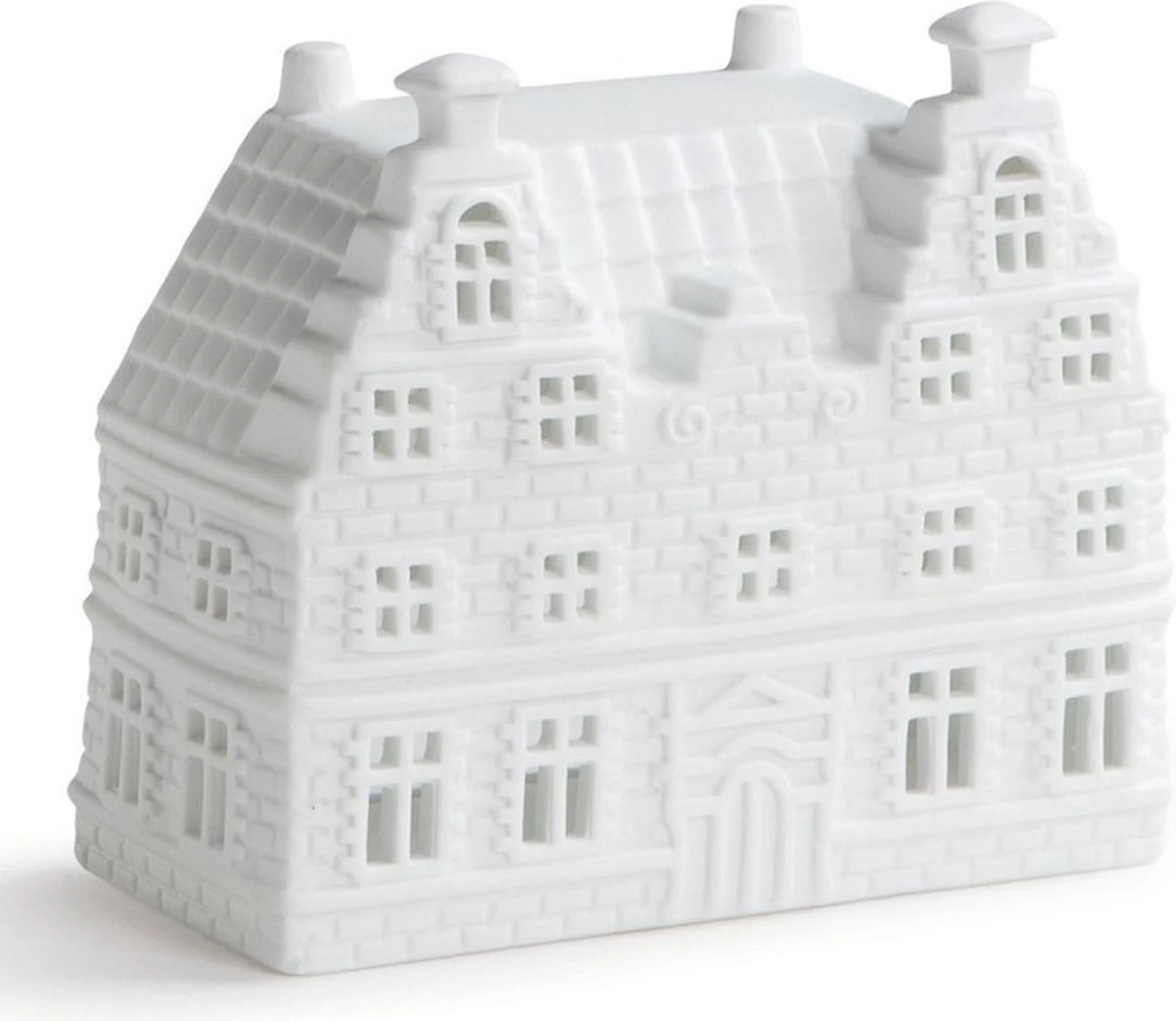 Via de opening aan de achterzijde van het grachtenhuisje is een waxinelichtje (evt. ook groot formaat) te plaatsen, zodat het warme kaarslicht door de ramen van het huisje schijnt. Direct sfeer! Decoratief wit grachtenhuisje.