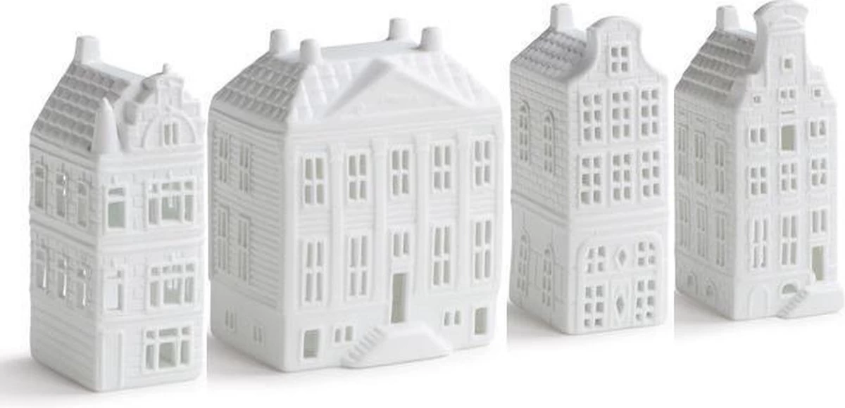 Mooie set waxinelichthouders, set van 4 stuks, in de sfeer van de bekende grachtenpandjes.