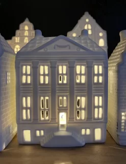 Breng sfeer in je huis met deze mooie straat van typisch Hollandse grachtenhuisjes waxinelichthouders. Als je een waxinelichtje in het grachtenpand zet, lijkt het alsof de lampjes in de huisjes gezellig branden.